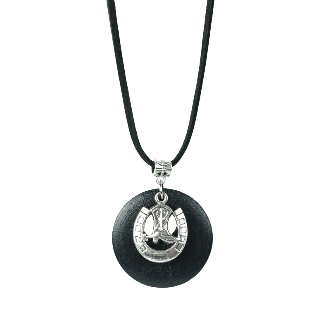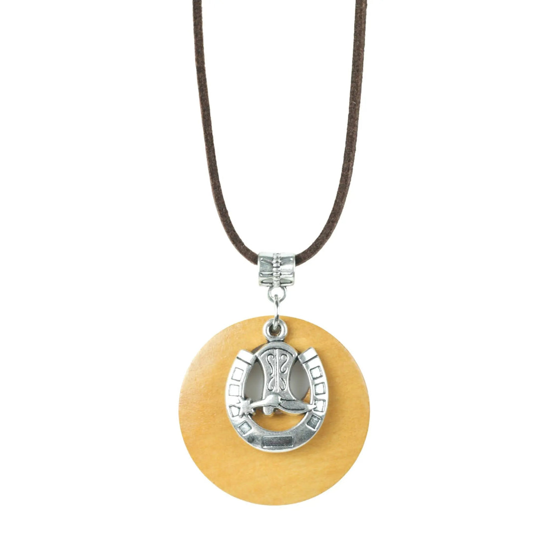 Introducing our captivating Horse Shoe/Cowboy Boot Charm Necklace, a symbol of luck and Western charm. This necklace features a 22mm metal charm in the shape of a Horse Shoe or a Cowboy Boot, elegantly paired with a 32mm timber pendant. It is suspended from an 80cm length of 3mm soft black or brown cord, creating a striking and versatile design.