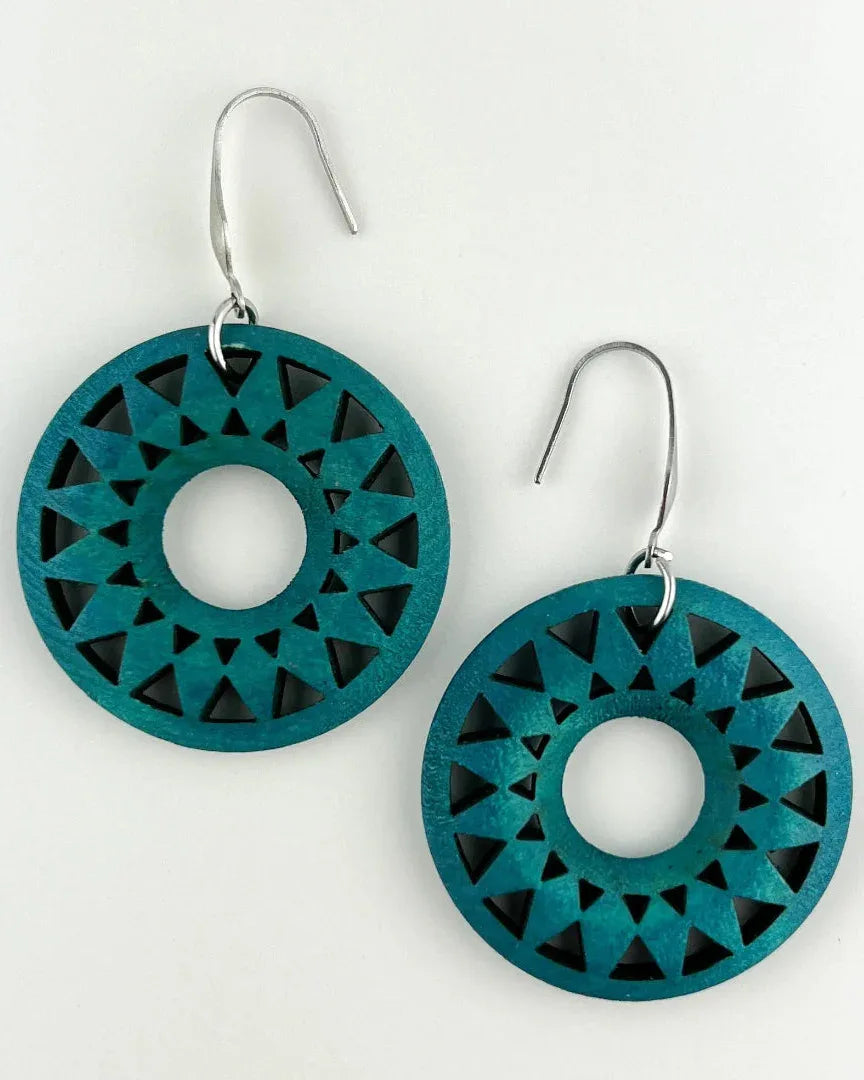 Boho timber earrings in rich teal with sunburst detail