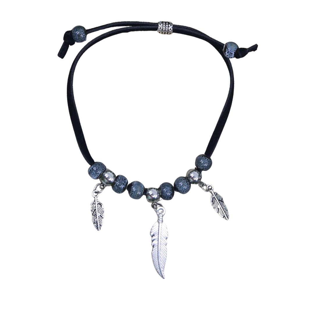 Add a little free-spirited charm to your wrist with our grey beaded feather bracelet. Strung with textured ceramic beads and finished with silver-tone feather charms, it’s the perfect everyday piece for anyone who loves a touch of boho style. The soft black faux leather cord makes it comfy to wear, while the adjustable tie means it’ll fit just right.