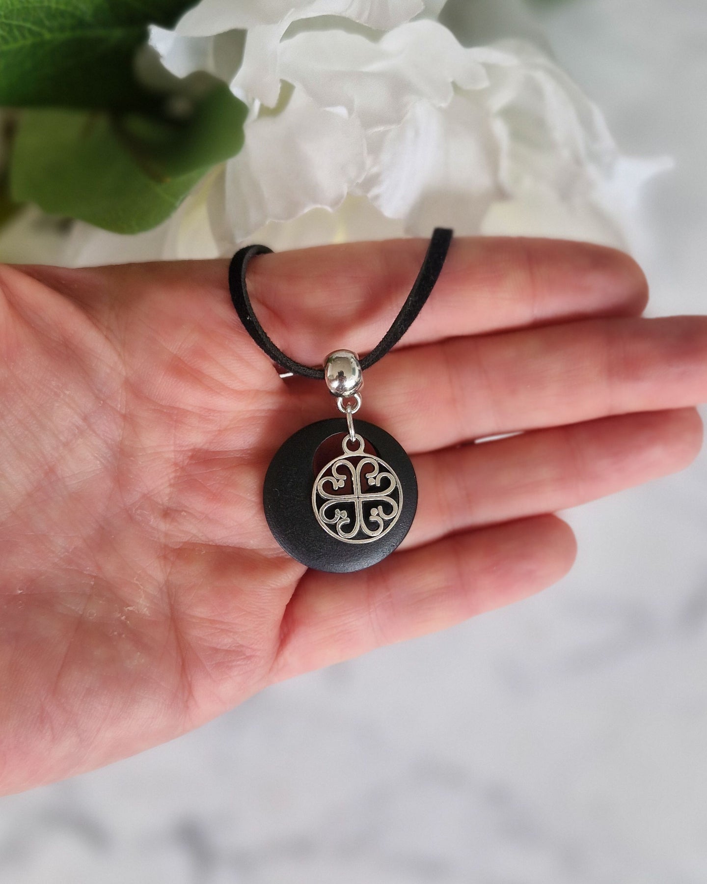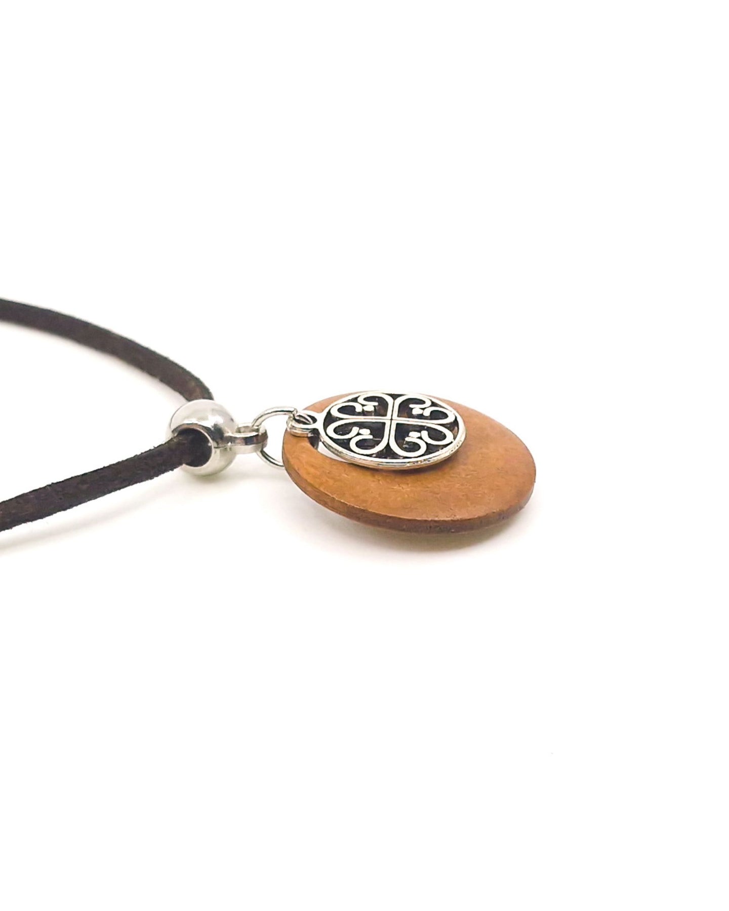 The Circle of Hearts Charm Necklace is a quiet statement of love, connection, and everyday style. Featuring a silver-tone circle of hearts charm layered over a round timber pendant, it’s designed to feel thoughtful without being overdone.