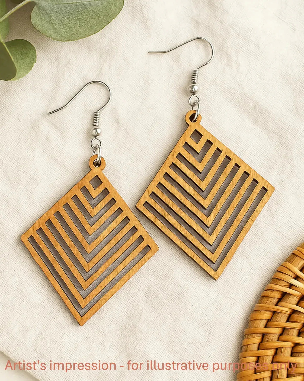 Alt text: Pair of Izzy diamond shaped geometric timber drop earrings with layered chevron cut-outs on white background