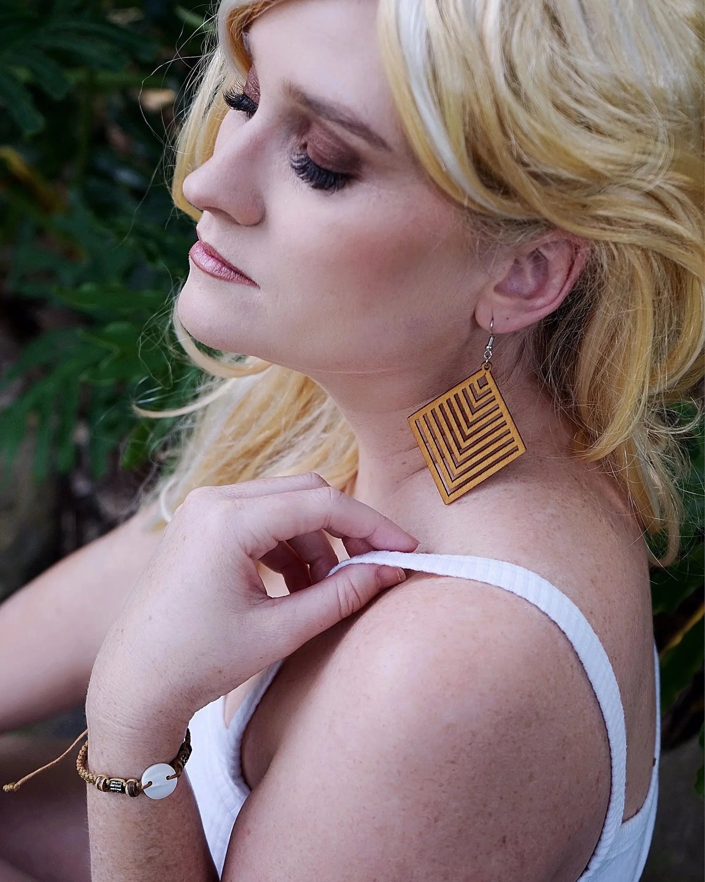 If you love a look that’s a bit more structured and "edgy-meets-earthy," the Izzy drops are your new best friend. The stacked chevron pattern inside the diamond shape creates a beautiful sense of depth and movement, catching the light as you turn your head. They have that perfect "graphic designer at a Saturday brunch" energy - sharp, clean, and effortlessly cool.