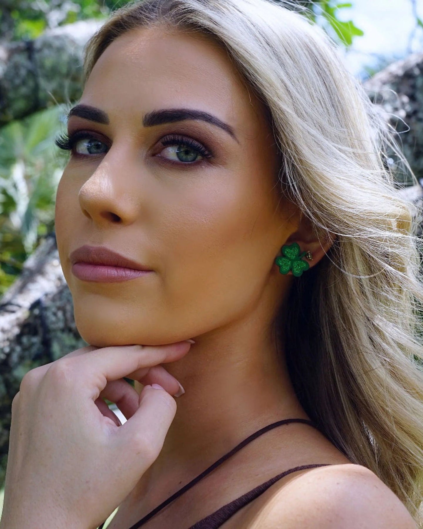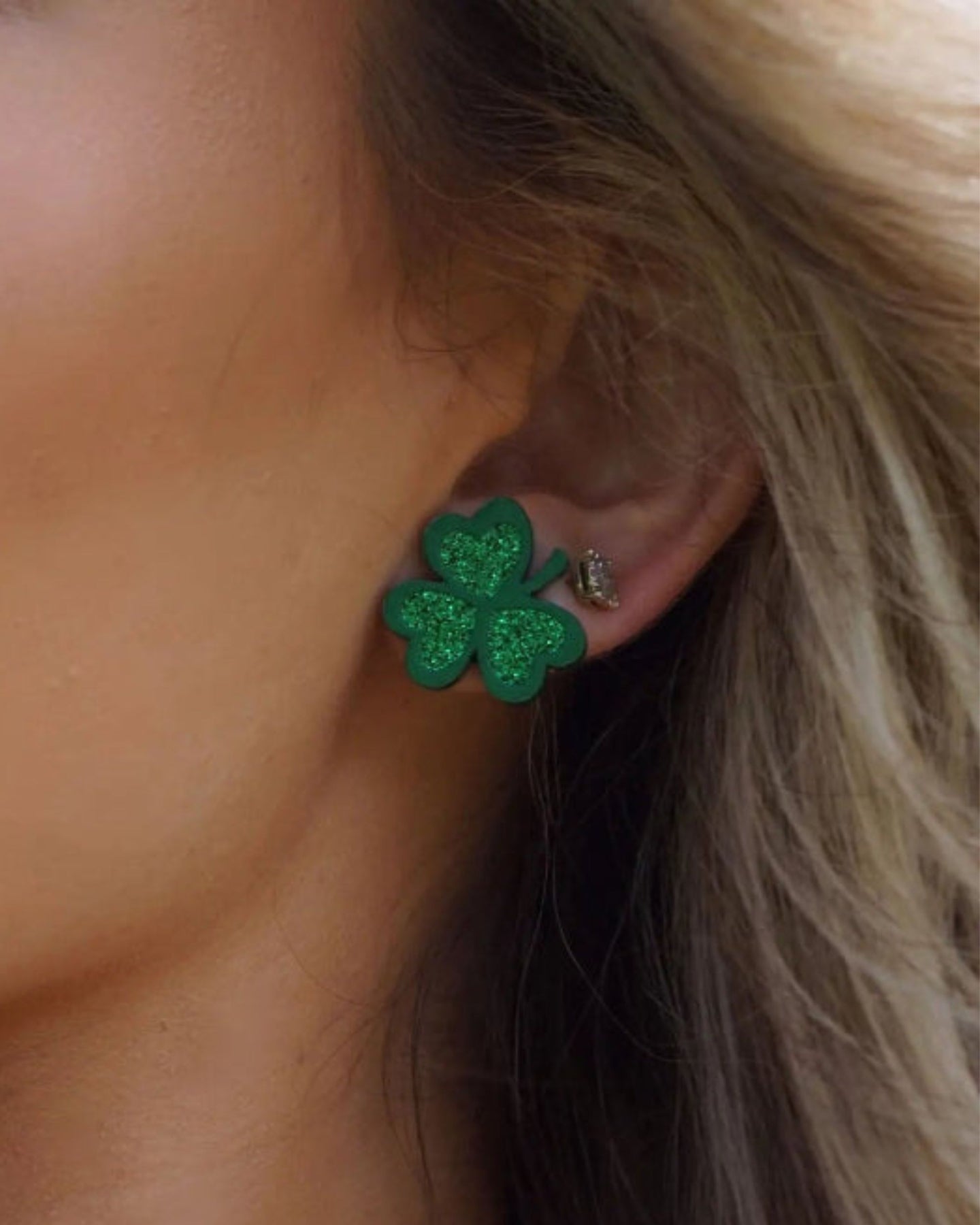 Model wearing green glitter shamrock stud earrings, showing fit and festive St Patrick’s Day style
