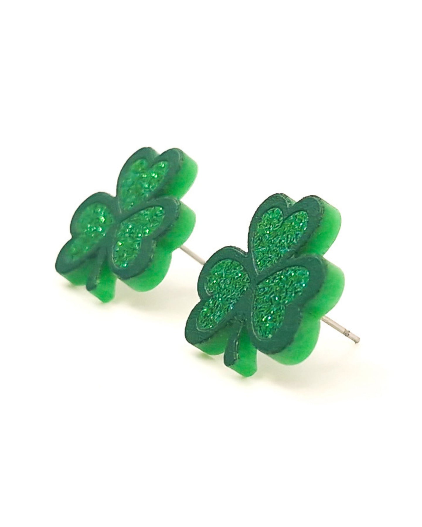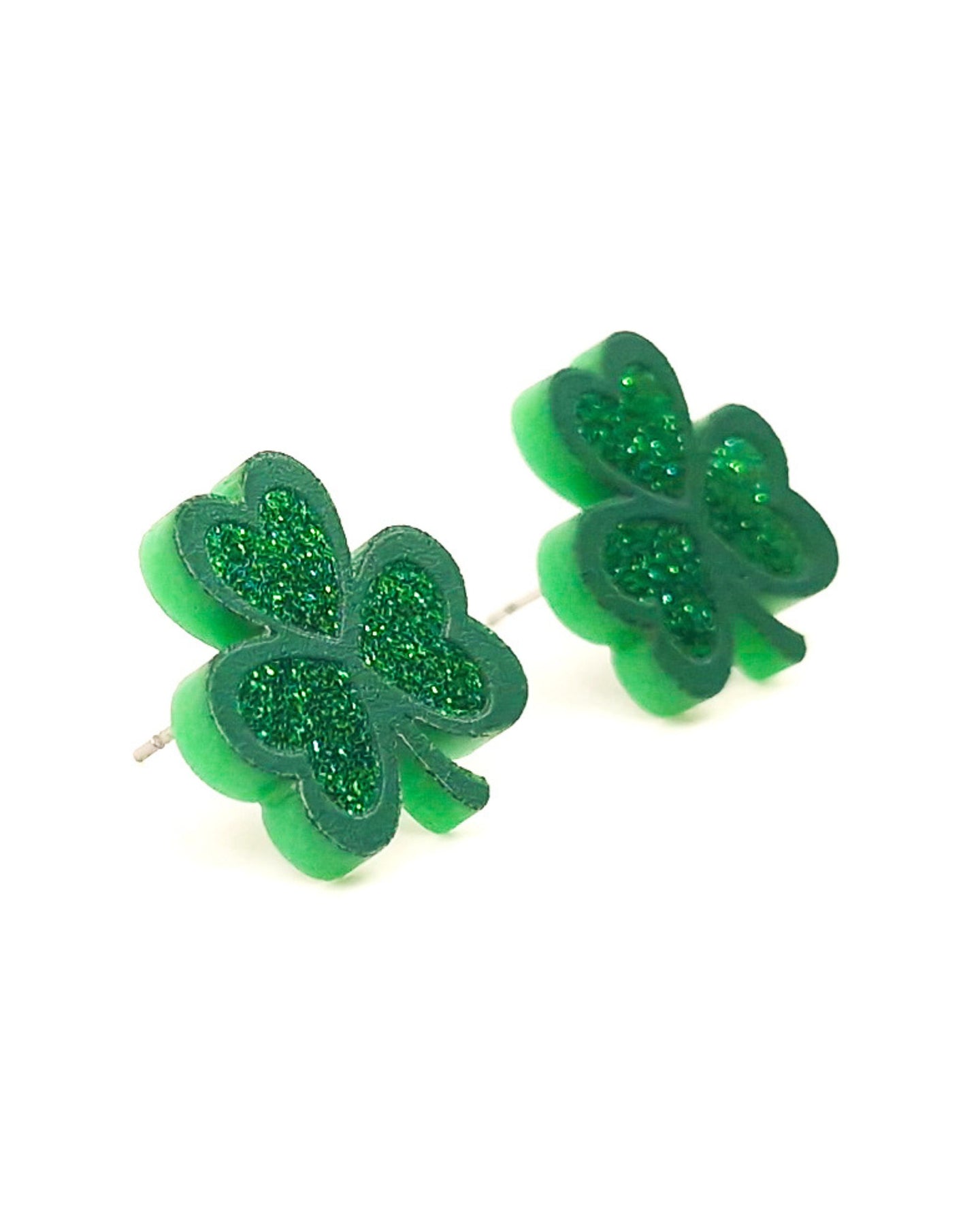 Close-up of green glitter shamrock stud earrings showing layered clover shape and glitter texture