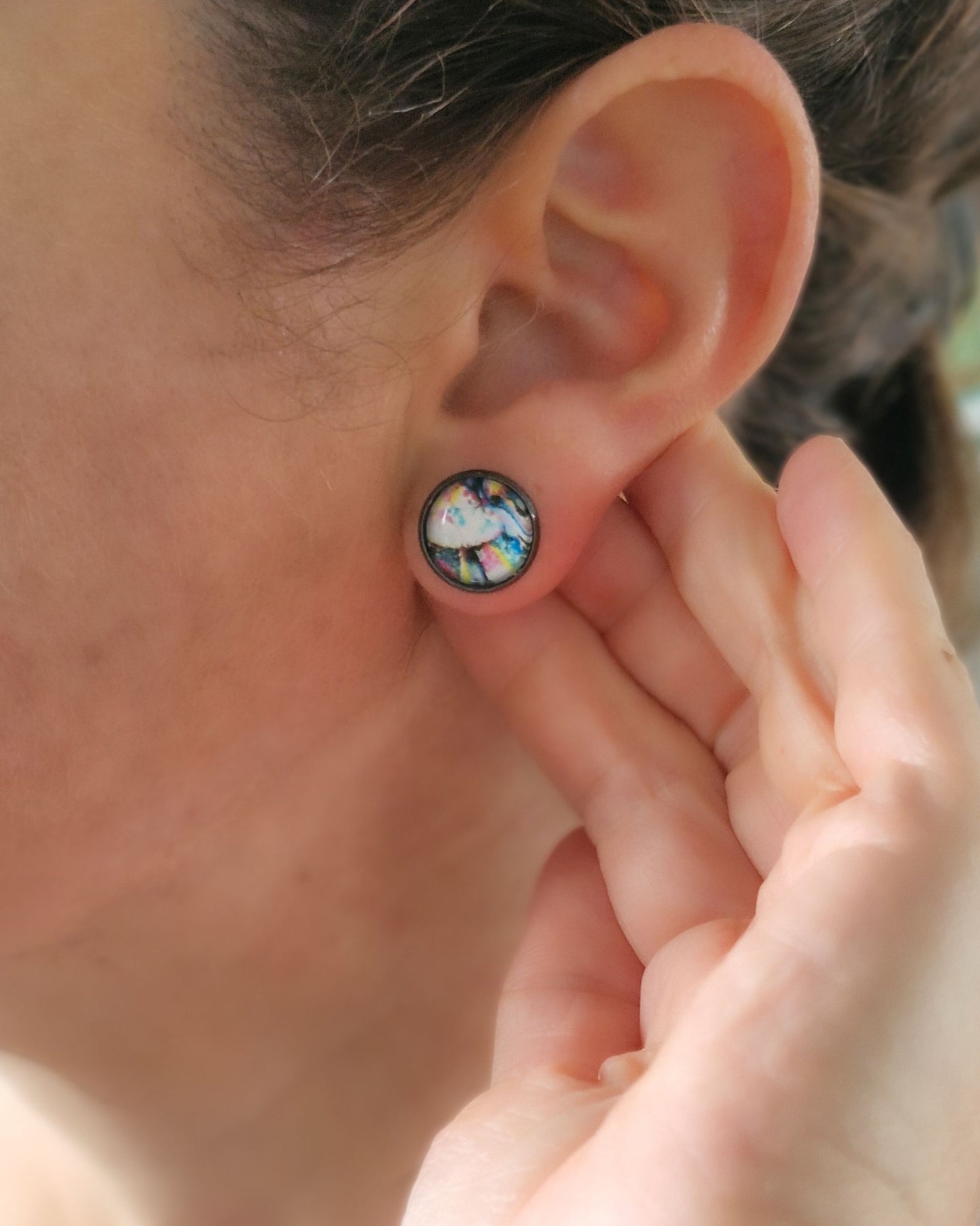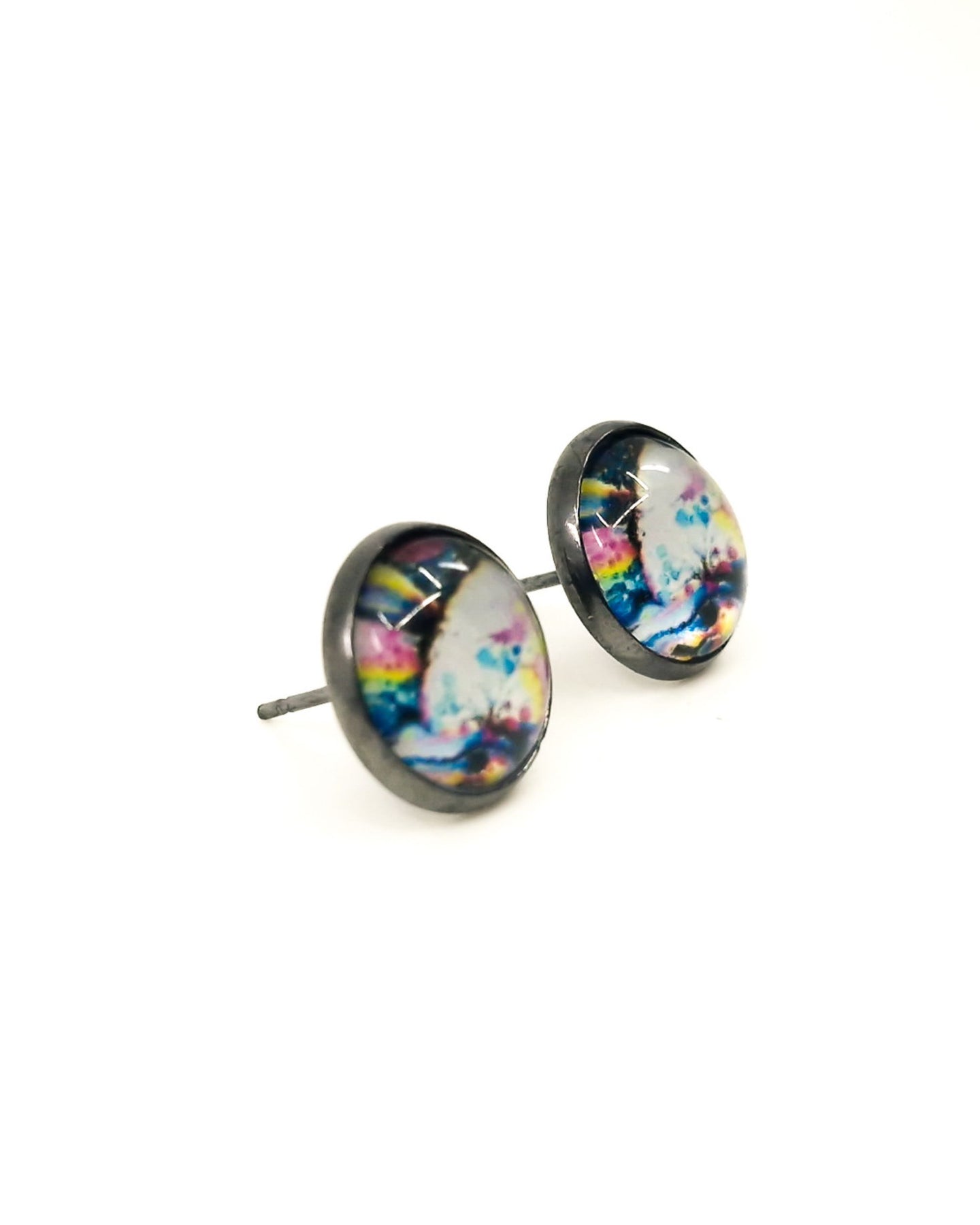 Featuring a soft abstract rainbow design under smooth glass, these studs have a gentle, artistic feel rather than bold statement energy. The colours blend and move beautifully, making them easy to wear day to day - whether you’re dressing simply or adding a hint of personality to your look.