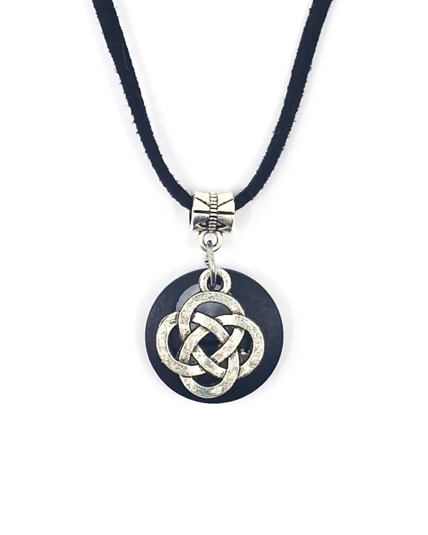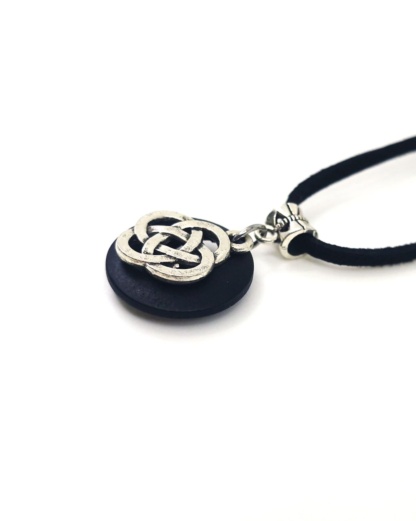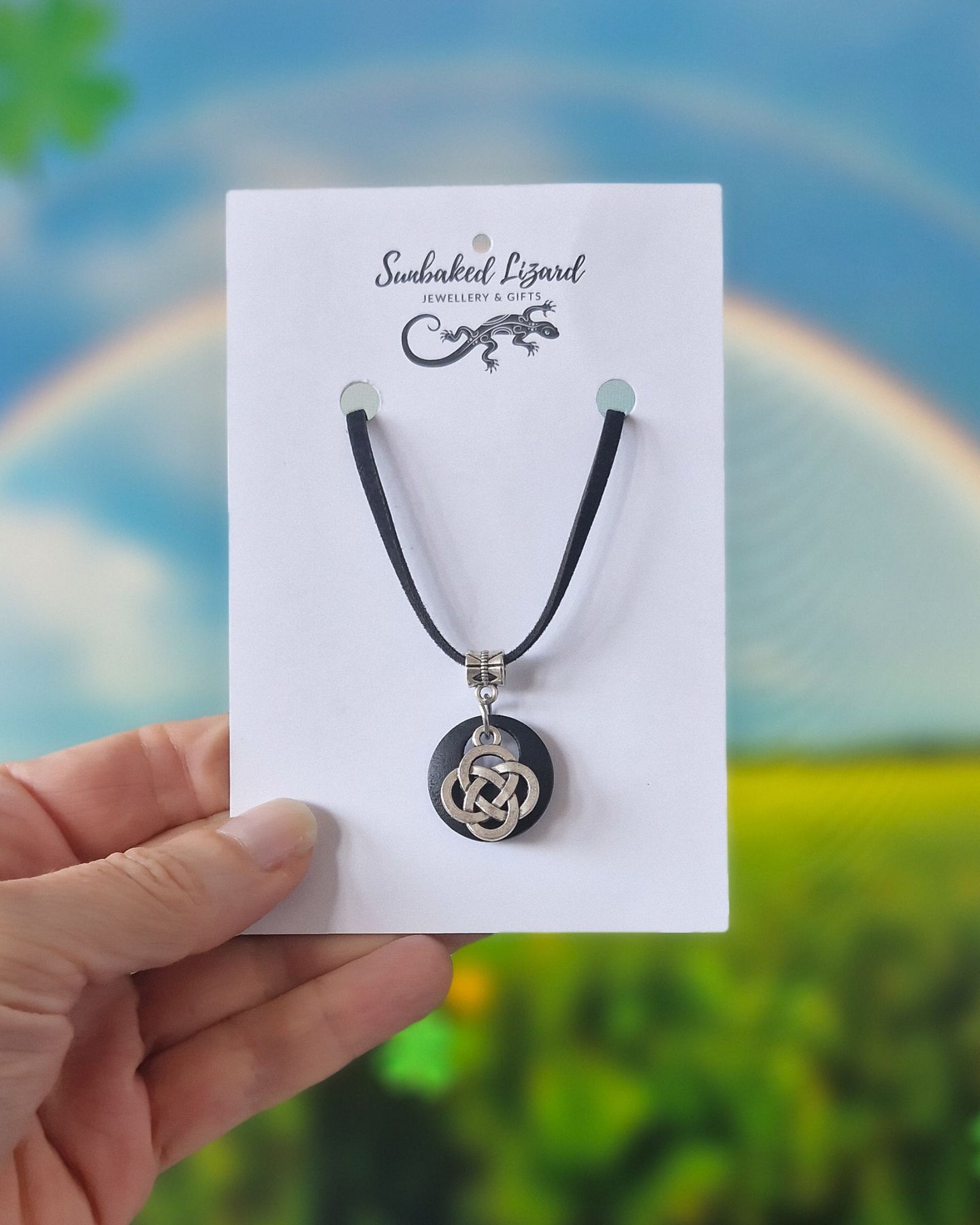 The interwoven knot represents connection, strength, and continuity, giving this necklace a deeper meaning that feels especially fitting for St Patrick's Day. Set against a black timber backing, the metal knot stands out beautifully, creating contrast without shouting for attention.