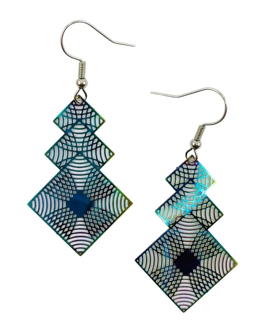 Each earring features stacked diamond-shaped filigree charms in an iridescent metal finish. The intricate open pattern creates beautiful depth and detail, while the colour shifts subtly as you move. In one light they appear teal, then blue, then flash with hints of green or violet at the edges. It’s not loud sparkle - it’s shimmer with intention.