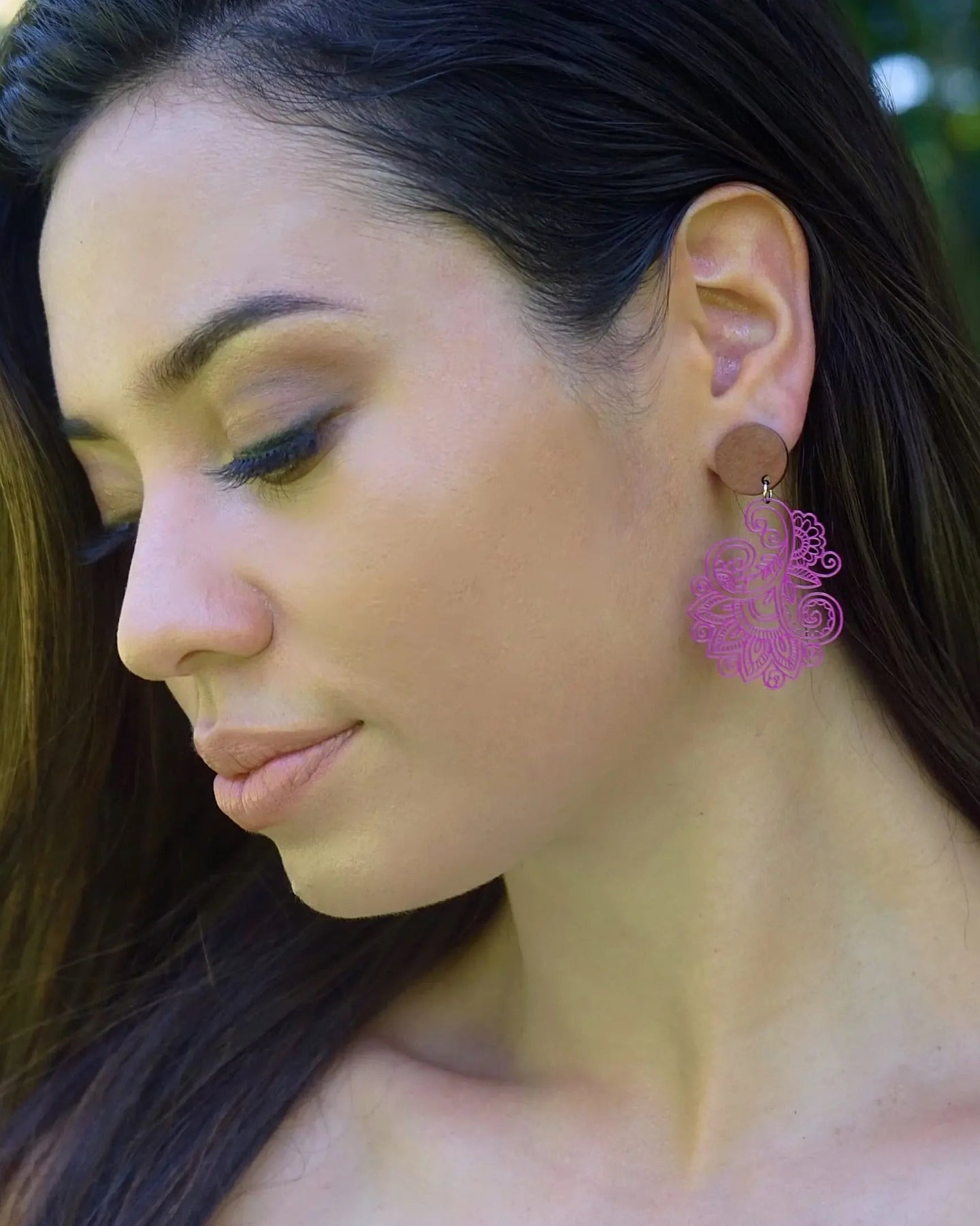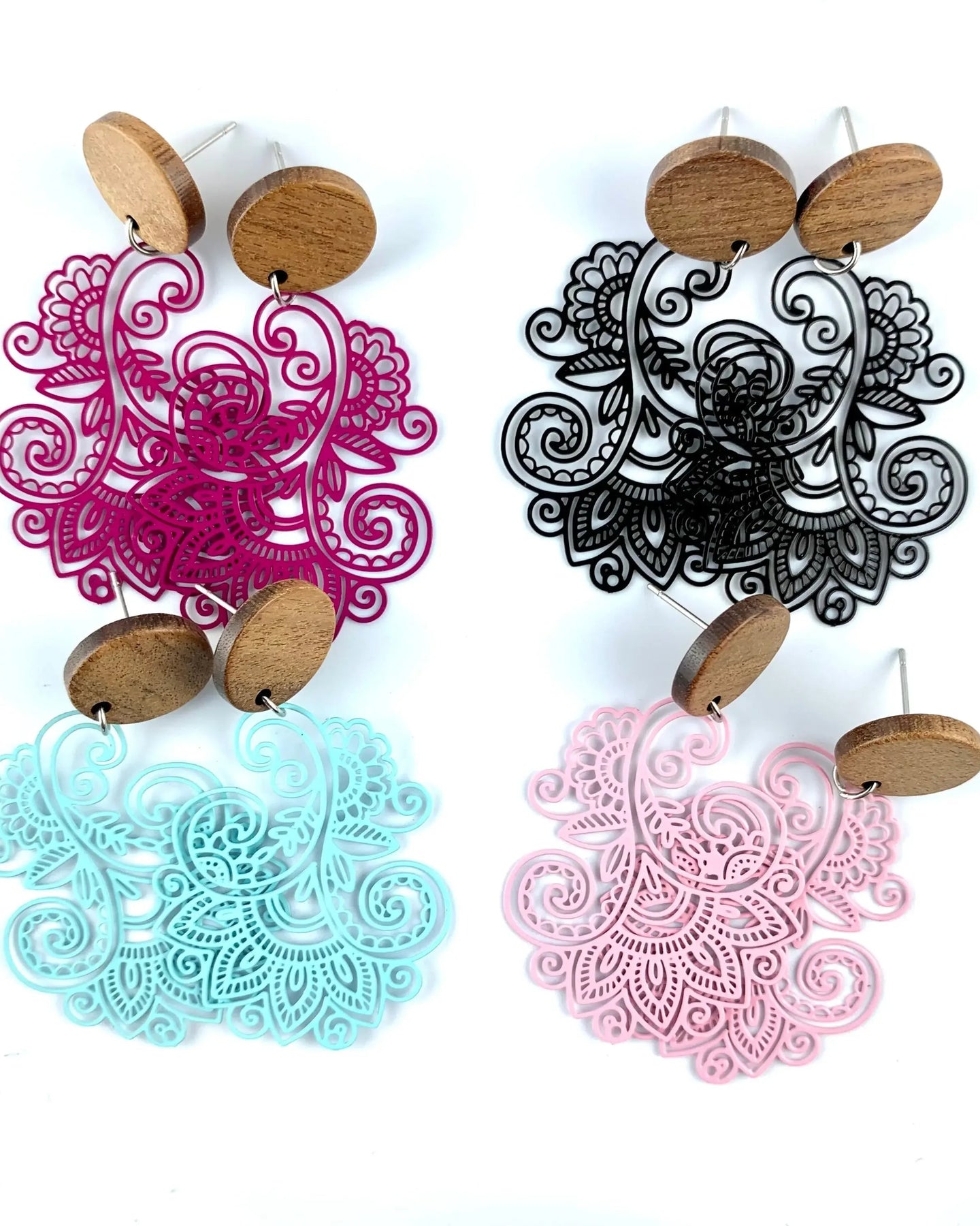 These aren't just dangles; they’re daydreams for your lobes. Our Filigree Lacey Drops bring a beautiful contrast of materials, pairing a smooth, matte timber stud top with a cascade of intricate metal filigree. The pattern is hypnotic - swirling vines and petal-like curves that feel like lacework reimagined with crisp, modern precision. Because of the open, airy design, light pours through the negative spaces, creating a subtle theatre of shadows as they move.