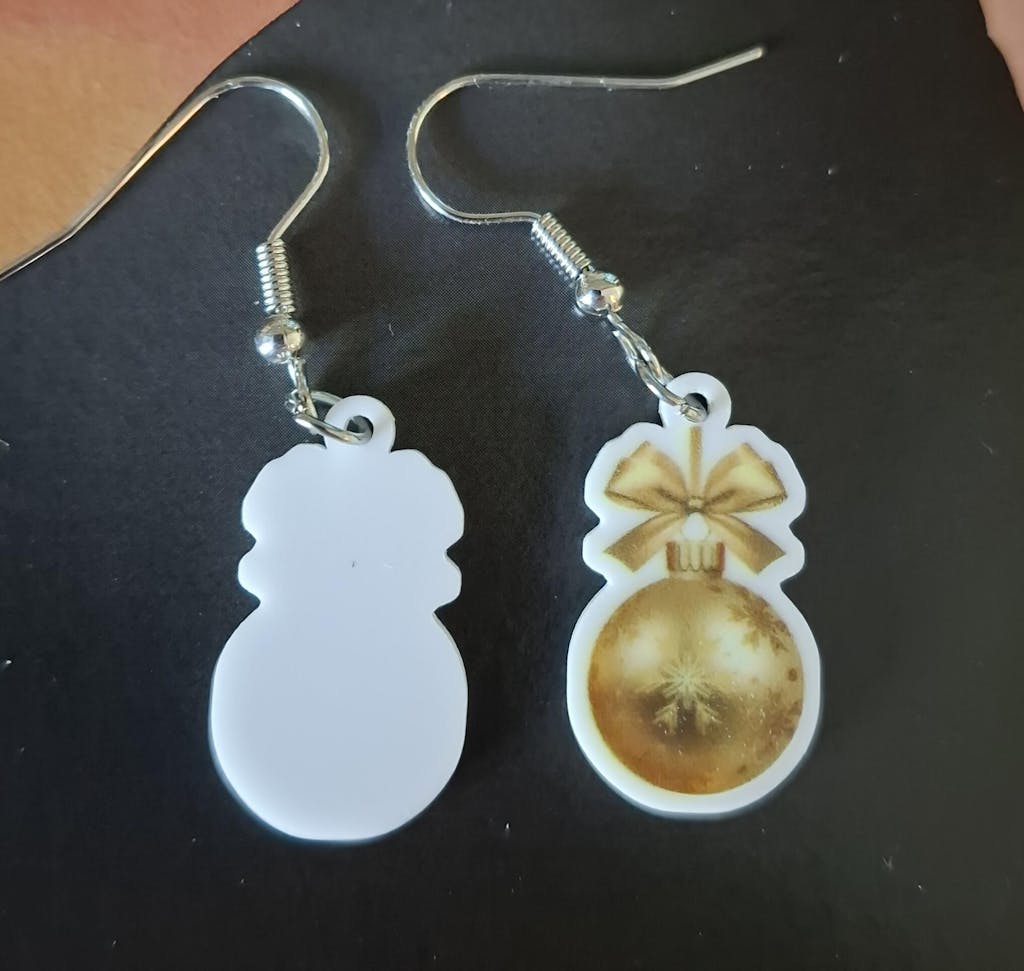 The ordering process was easy and the delivery was fast. However,from the photo and the description I was expecting to recieve an acrylic 3D "gold" bauble drop earing. Inside the earing is flat white acrylic with a photo of a gold bauble onlyvone side.